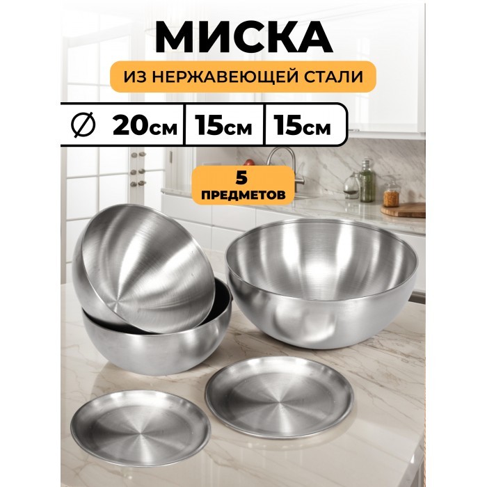 Набор Мисок из нержавеющей стали 5пред (15см- 2шт+20см-1шт +блюдце 14см-2шт) серебро 263334
