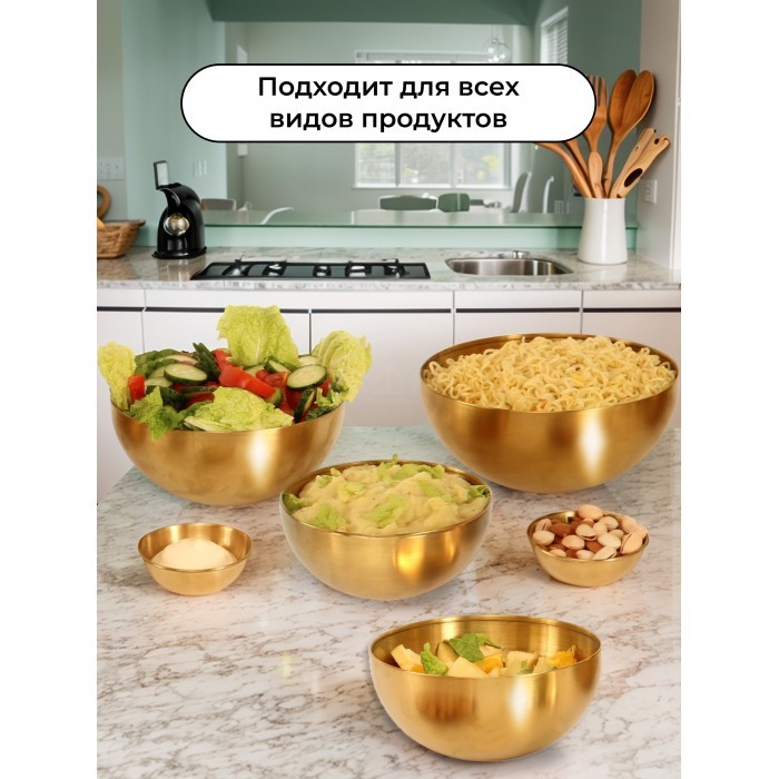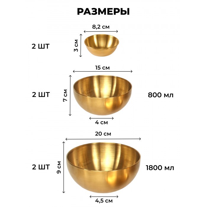 Набор Мисок из нержавеющей стали 6пред (15см-2шт+20см-2шт +соусник 8, 5 см-2 шт ) золото 265460