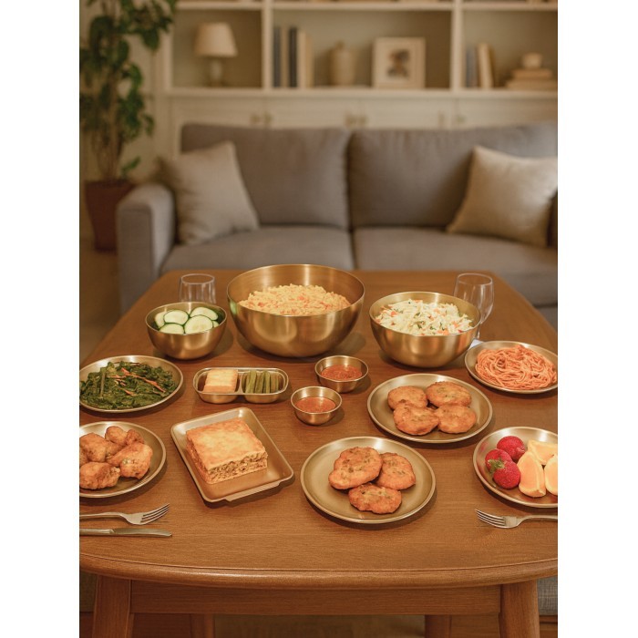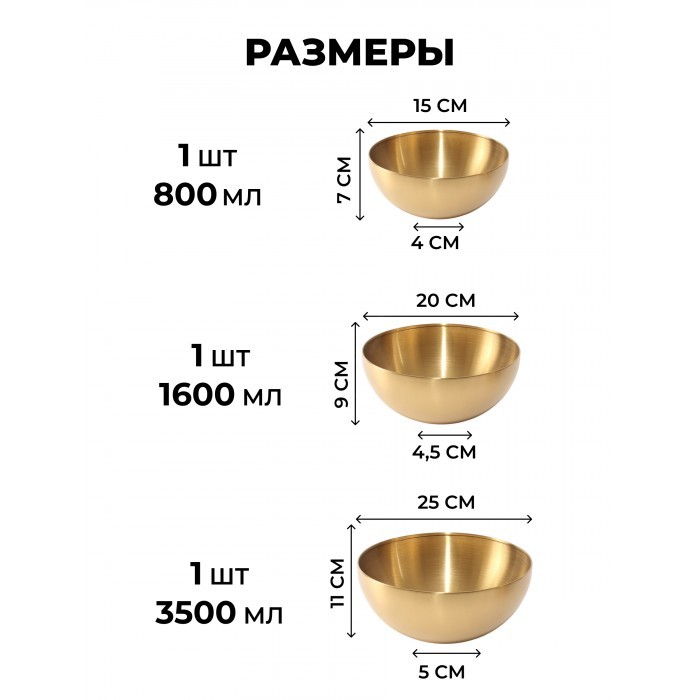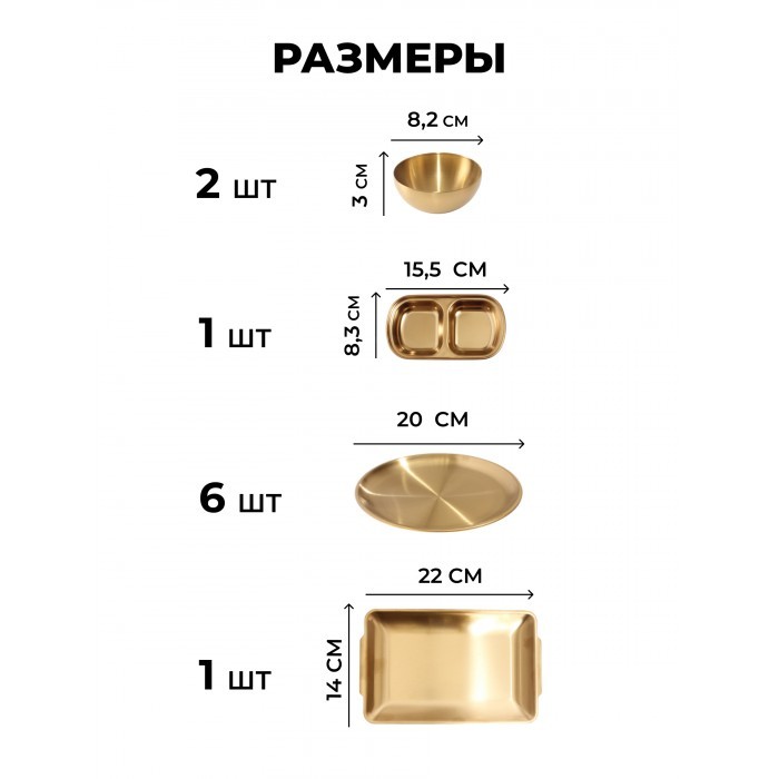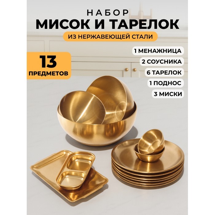 Набор Мисок из нержавеющей стали 13пред (15см-1шт+20см-1шт+25см-1шт+тарел 20см-6шт, бл.подн 22см-1шт, соус-2шт, менажница-1шт) золото 266207