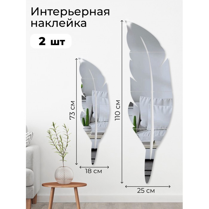 Интерьерные зеркальные наклейки Перо 2шт (110*25см-1 шт 73*18см-1шт) серебро 265534