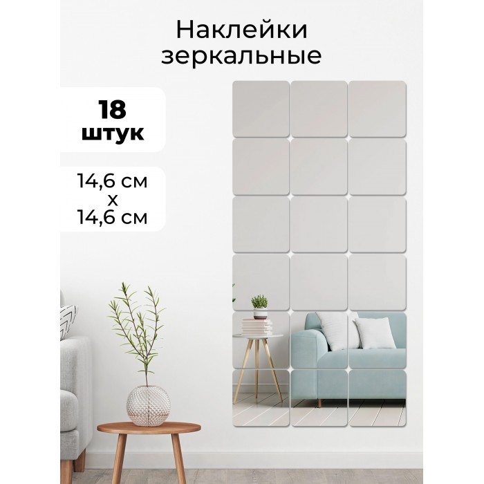 Интерьерные зеркальные наклейки Квадрат 18 шт ( 15*15 см, толщина 1мм) скругленные углы 265990